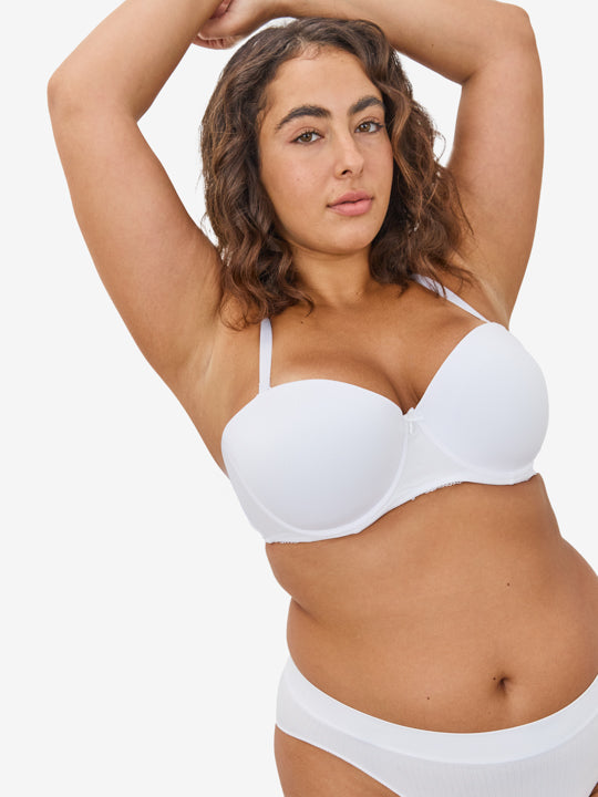 חזיית הסטרפלס החדשה של סילייה די היא פריט חובה בכל ארון בגדים. עשויה ממיקרופייבר חלק עם גימור פיקו עדין. היקף החזייה כוללת עצם צדדי רך המסייע לחזייה להישאר במקום במיוחד כשלובשים אותה בלי כתפיות. הקאפים מרופדים עם ברזלים מעוצבים בגזרת באלקונט קלאסית ועיטור פפיון במרכז. הכתפיות מתנתקות וניתנות להתאמה במגוון דרכים: על כתף אחת, מוצלבות בגב, או קלאסיות ישרות.